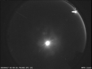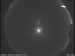 Over eighty eyewitnesses in the states of Arizona, California and New Mexico have filed reports with the American Meteor Society regarding a bright fireball seen on the night of April 16 (Tuesday) at 7:59:31 PM Mountain Standard Time. The event was also detected by 3 NASA Fireball Network cameras in southern Arizona, and an analysis of the available data shows that the fireball became visible at an altitude of 49 miles over Big Horn Mountains Wilderness. Moving southwest at 32,300 miles per hour, the meteor passed over Interstate 10 before breaking apart 11 miles above the southern part of Eagletail Mountains Wilderness. The trajectory gives a typical asteroidal orbit and the relatively slow speed and final altitude suggest that this fireball may have produced meteorites in the area west of Gillespie.